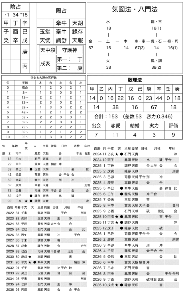 本能や家系の流れ、肉体を見る「陰占」と、性格や才能、人との関わり方などを見る「陽占」、そして人生の時間の流れを示す「後天運」の三つの側面から成り立っています。